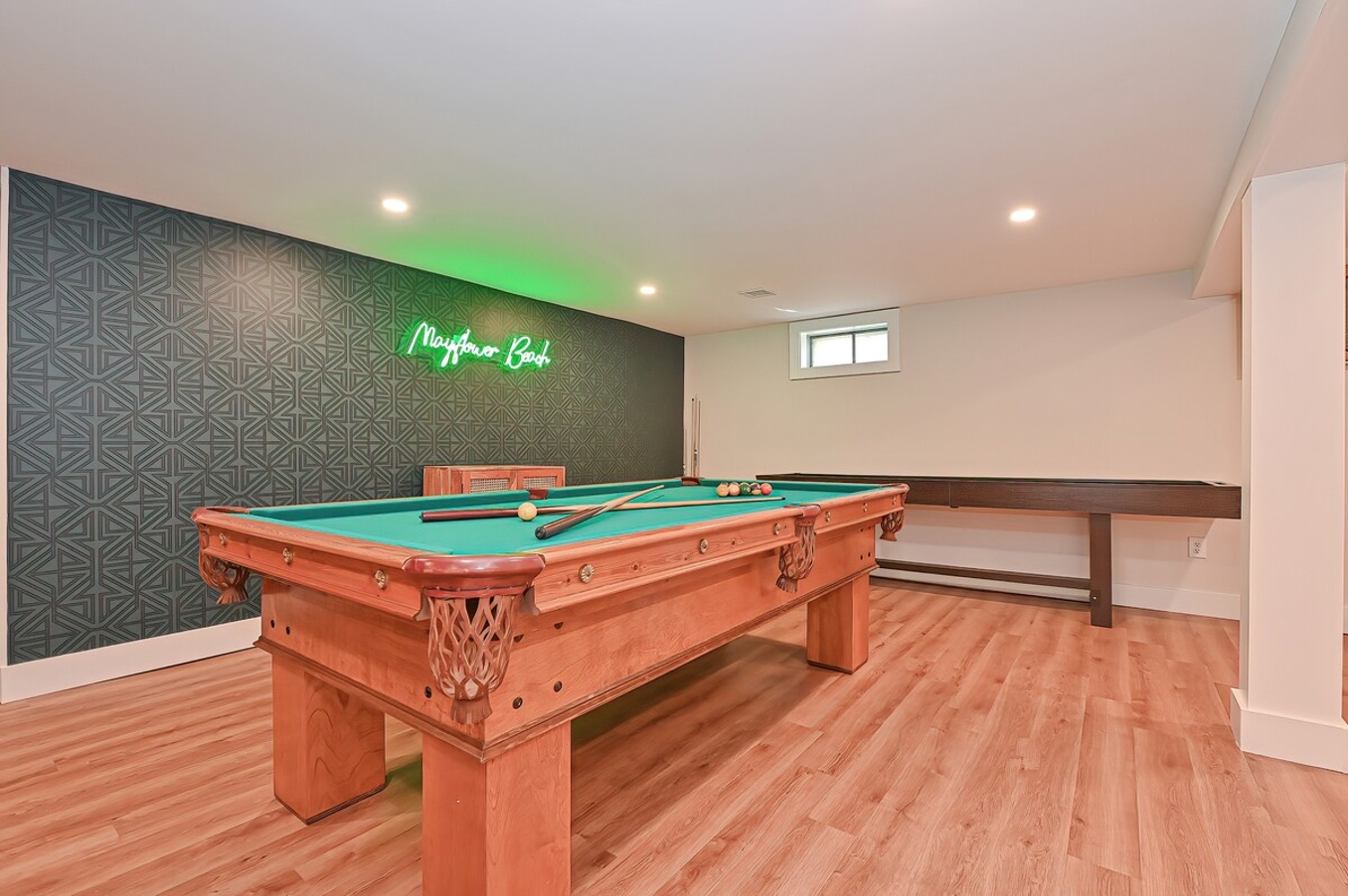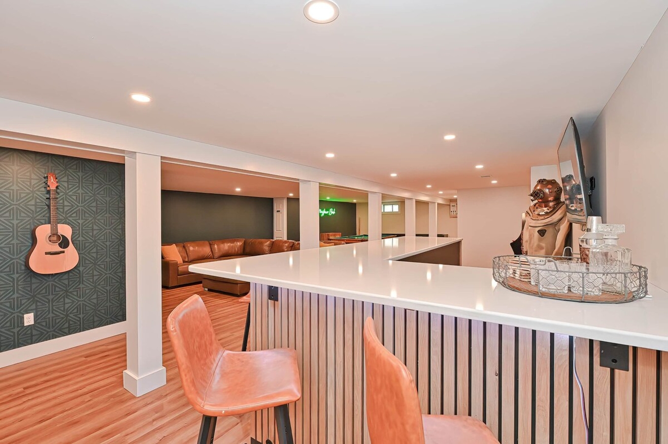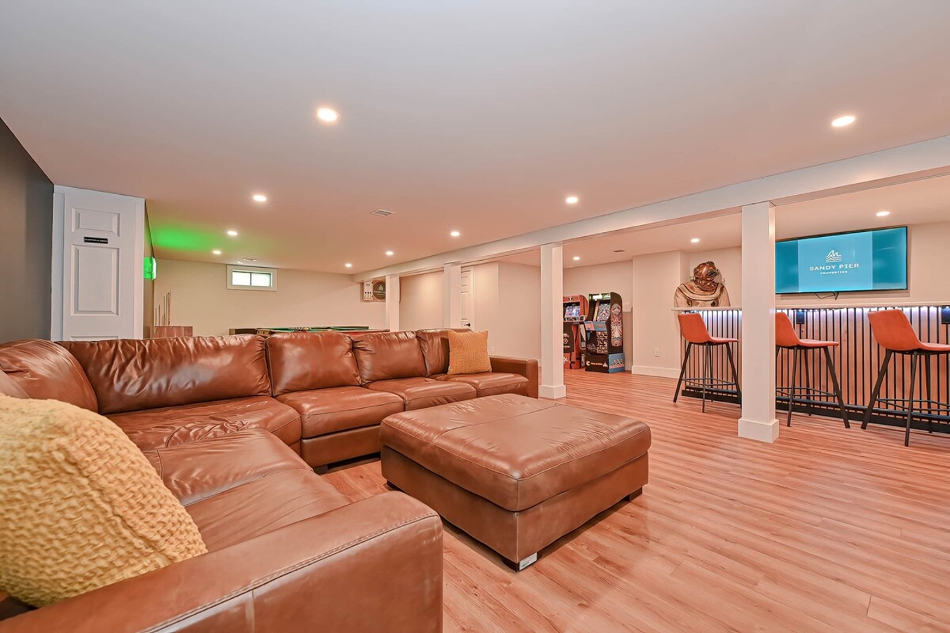 The basement game room is a highlight, featuring a pool table, ping pong, arcade games, a bar for refreshing drinks, and darts for friendly competition. It’s the perfect space for bonding and creating memories with loved ones.