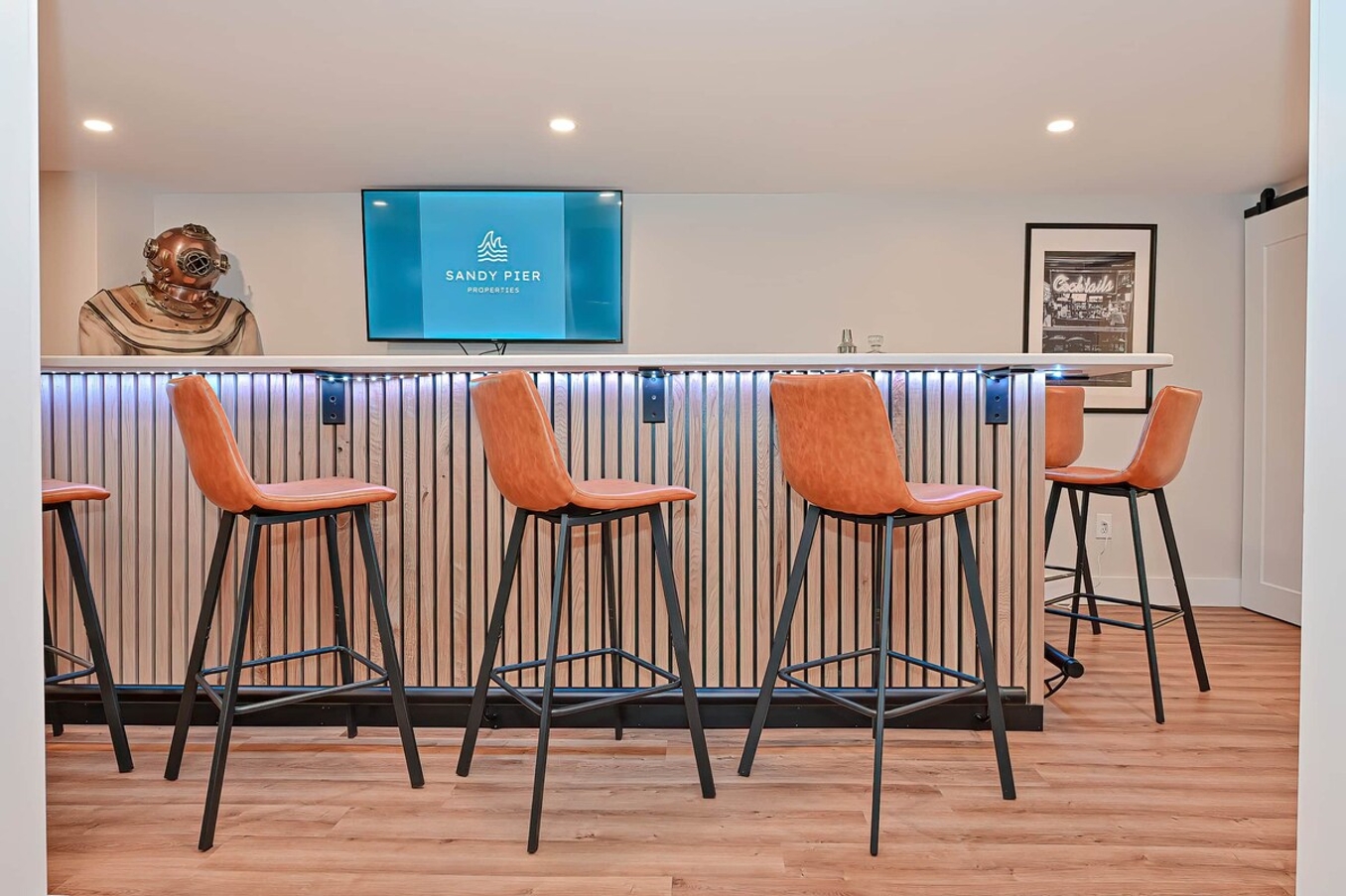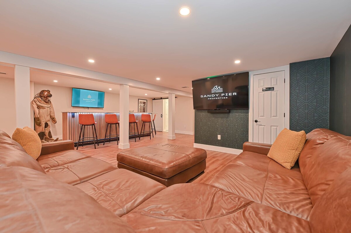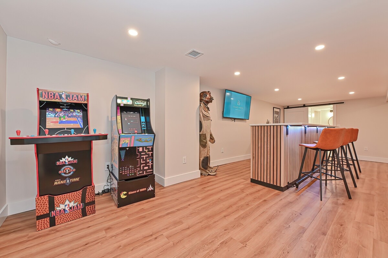 The basement game room is a highlight, featuring a pool table, ping pong, arcade games, a bar for refreshing drinks, and darts for friendly competition. It’s the perfect space for bonding and creating memories with loved ones.