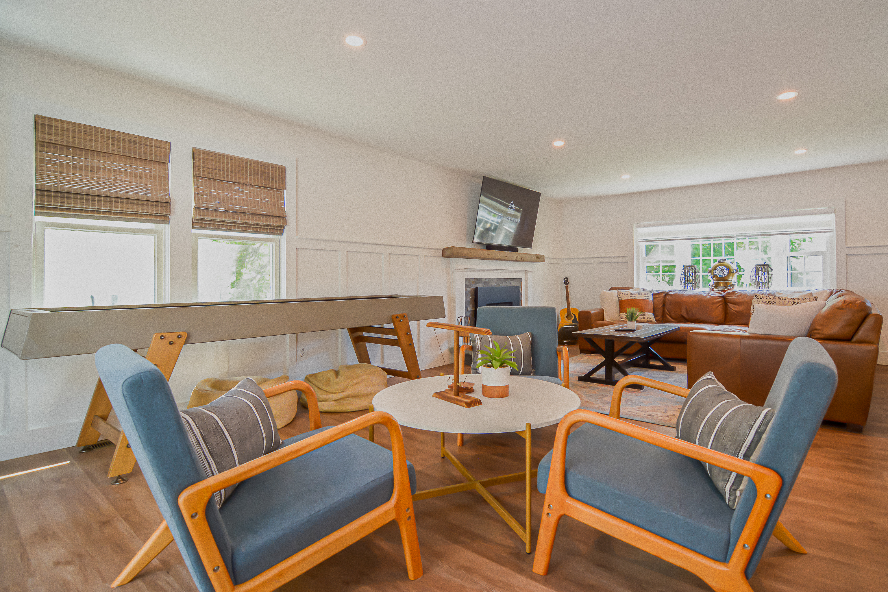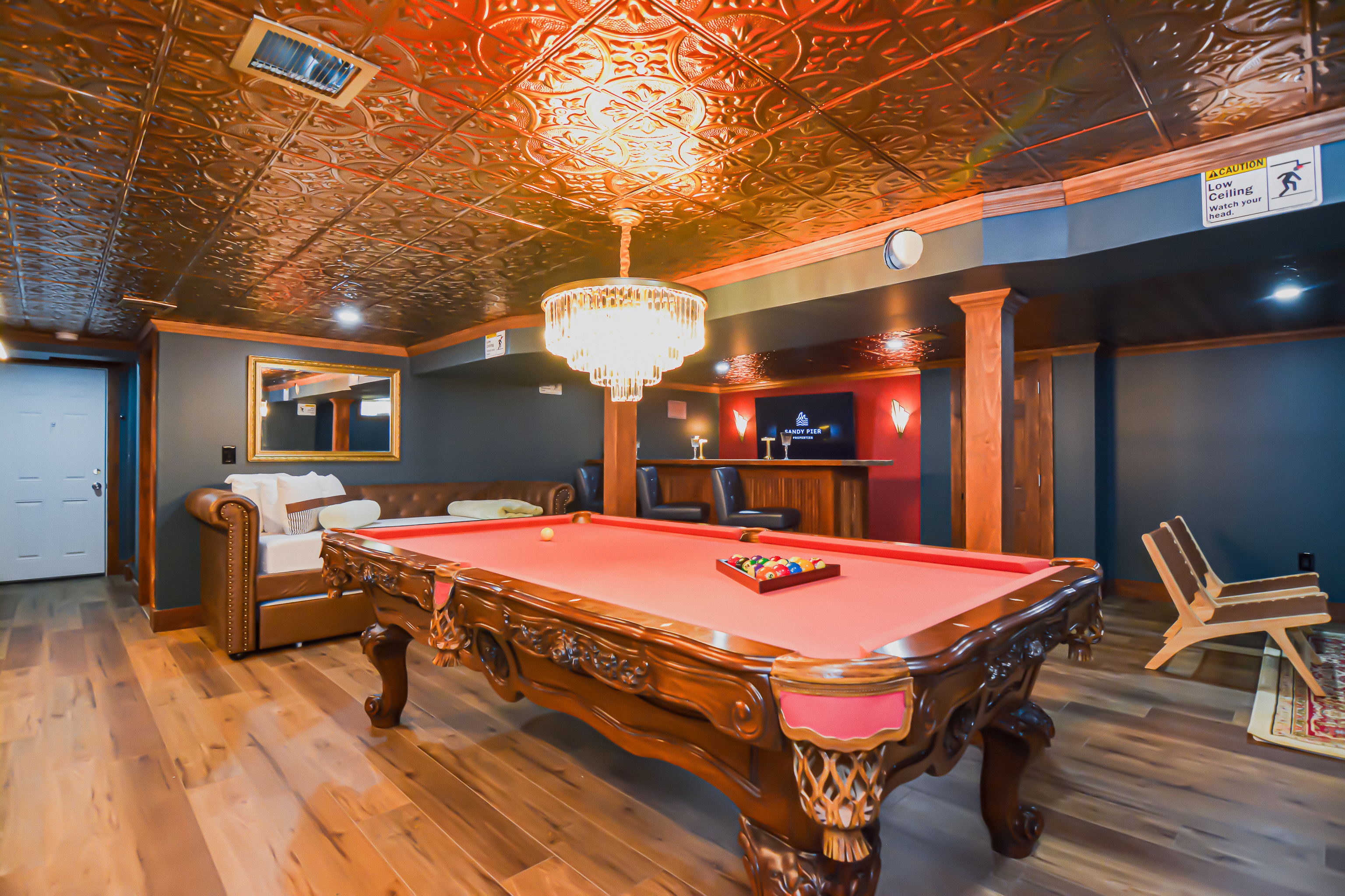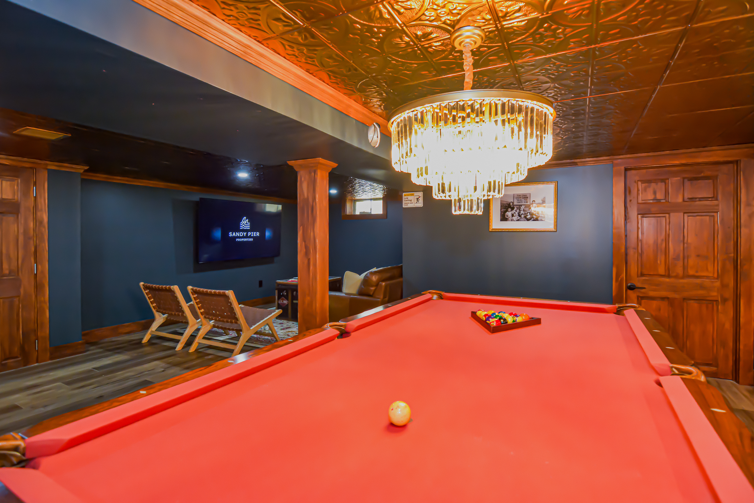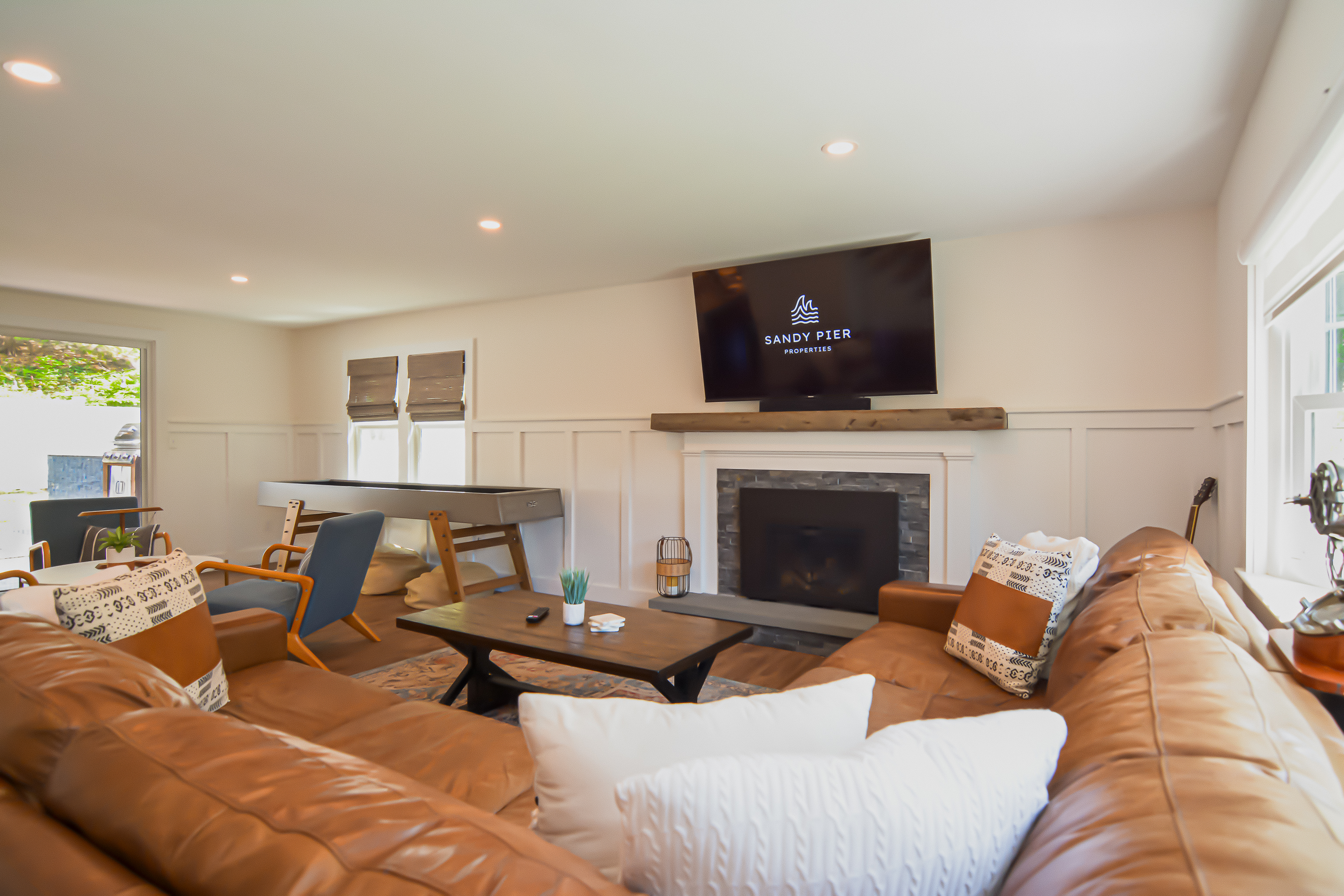 Inside, the bright and airy living room features a cozy gas fireplace, creating a welcoming space for gathering after a day at the beach. The well-appointed bathrooms add a touch of luxury with their clean, modern design and refreshing rain head showers. The finished basement boasts a speakeasy-style bar, complete with a pool table and a relaxed ambiance, making it the ideal spot for game nights and casual fun.