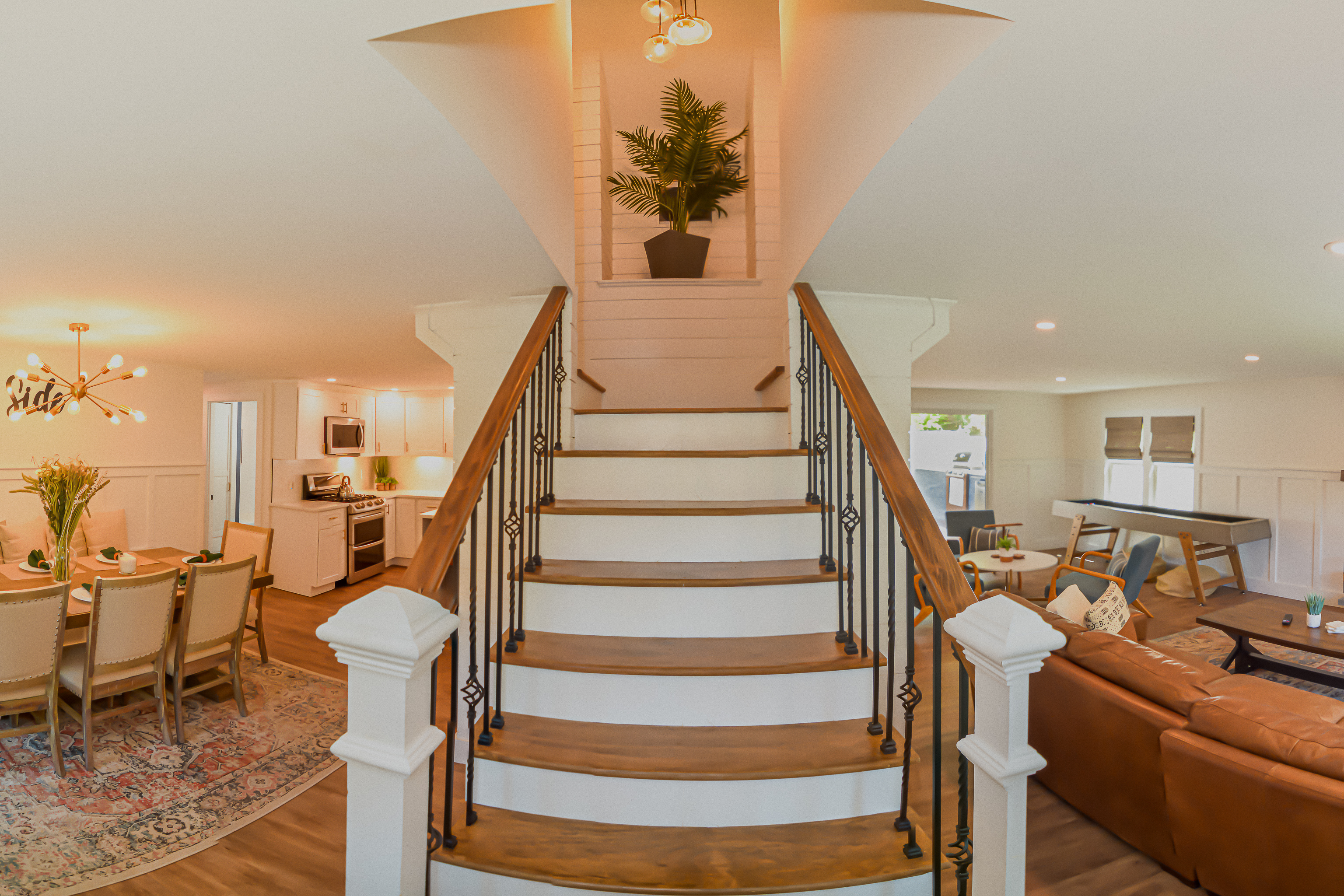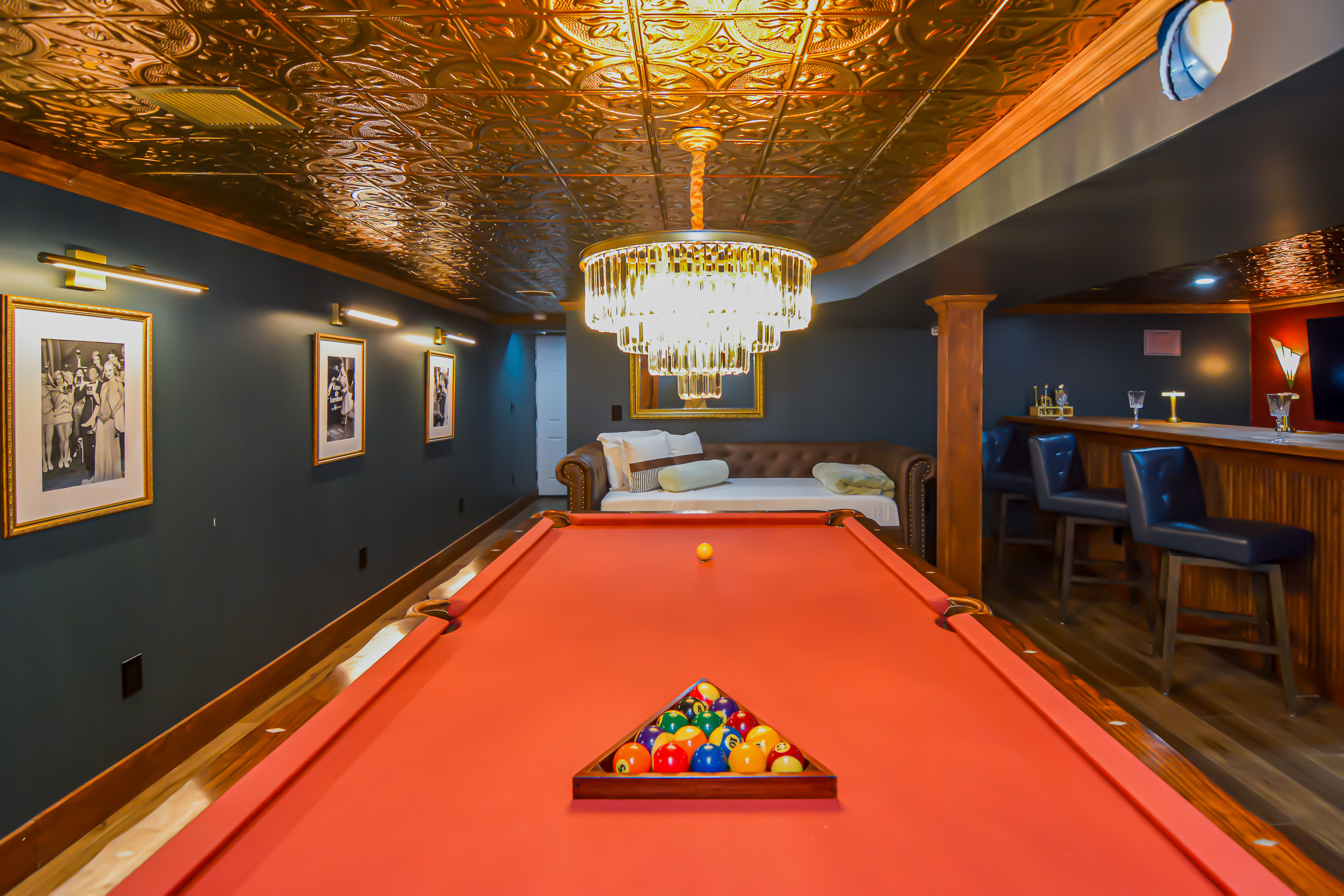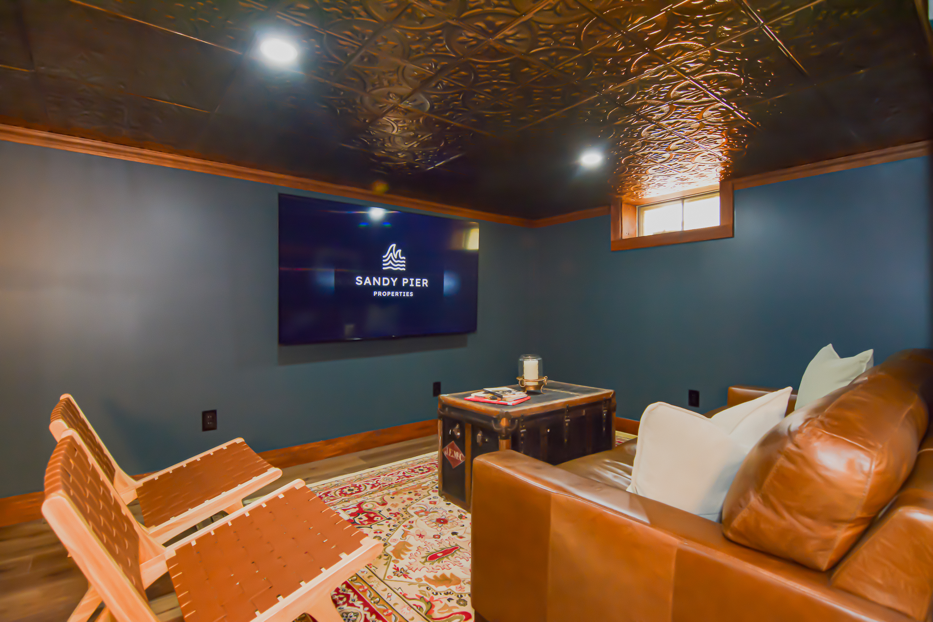 Inside, the bright and airy living room features a cozy gas fireplace, creating a welcoming space for gathering after a day at the beach. The well-appointed bathrooms add a touch of luxury with their clean, modern design and refreshing rain head showers. The finished basement boasts a speakeasy-style bar, complete with a pool table and a relaxed ambiance, making it the ideal spot for game nights and casual fun.